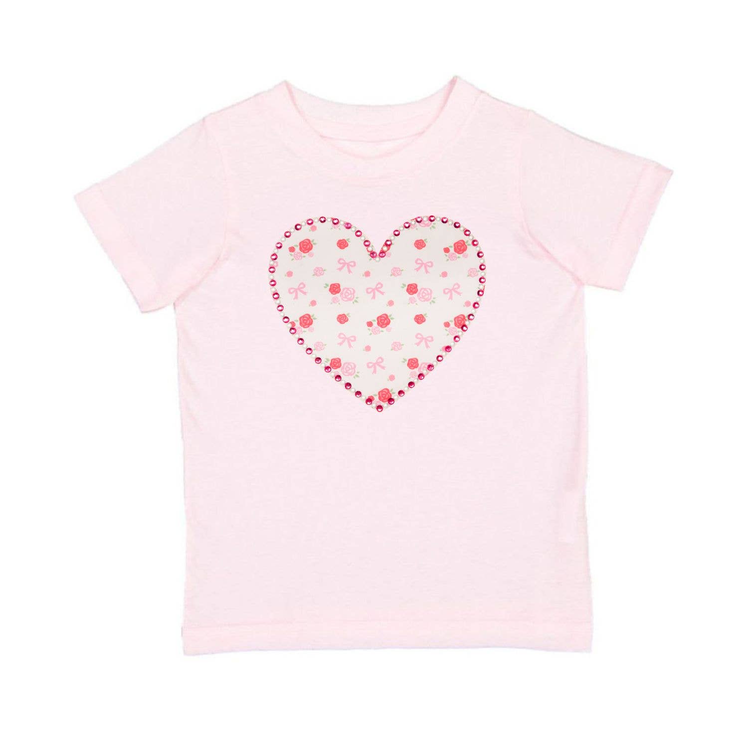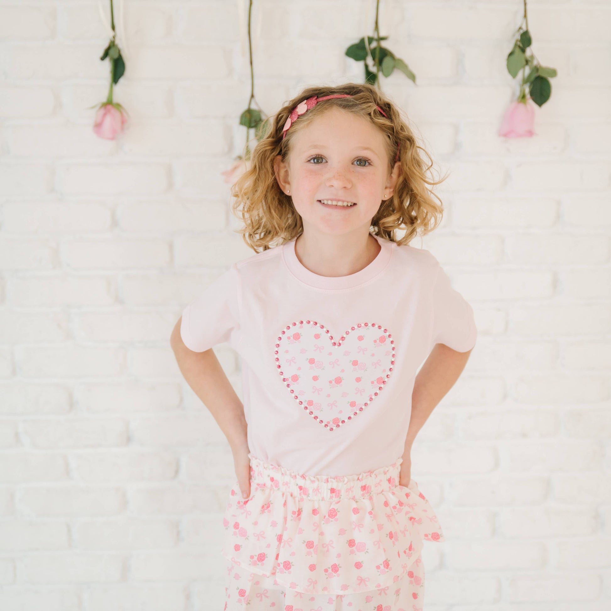 This sweet pink tee shines with a floral heart outlined in pearl and gem embellishments, perfect for adding a little sparkle to her day!