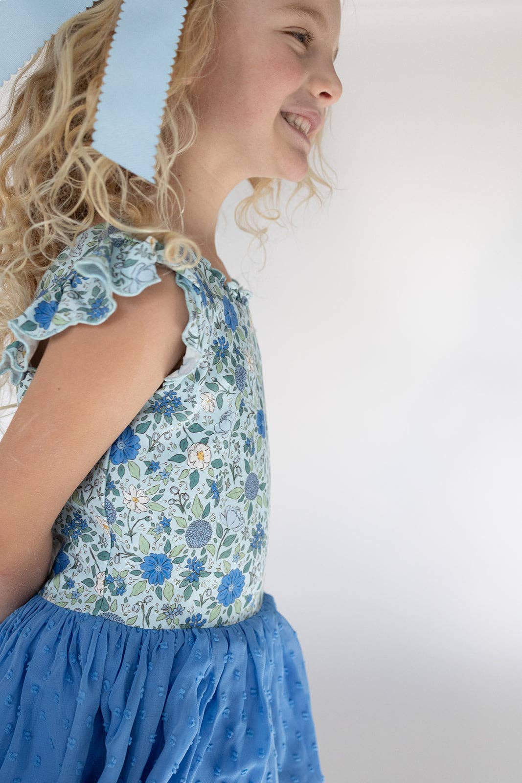 The Farrah Leotard in Cerulean Dreams is perfect for twirling with its dreamy blue floral design. Made for girls who love to dance and dream.