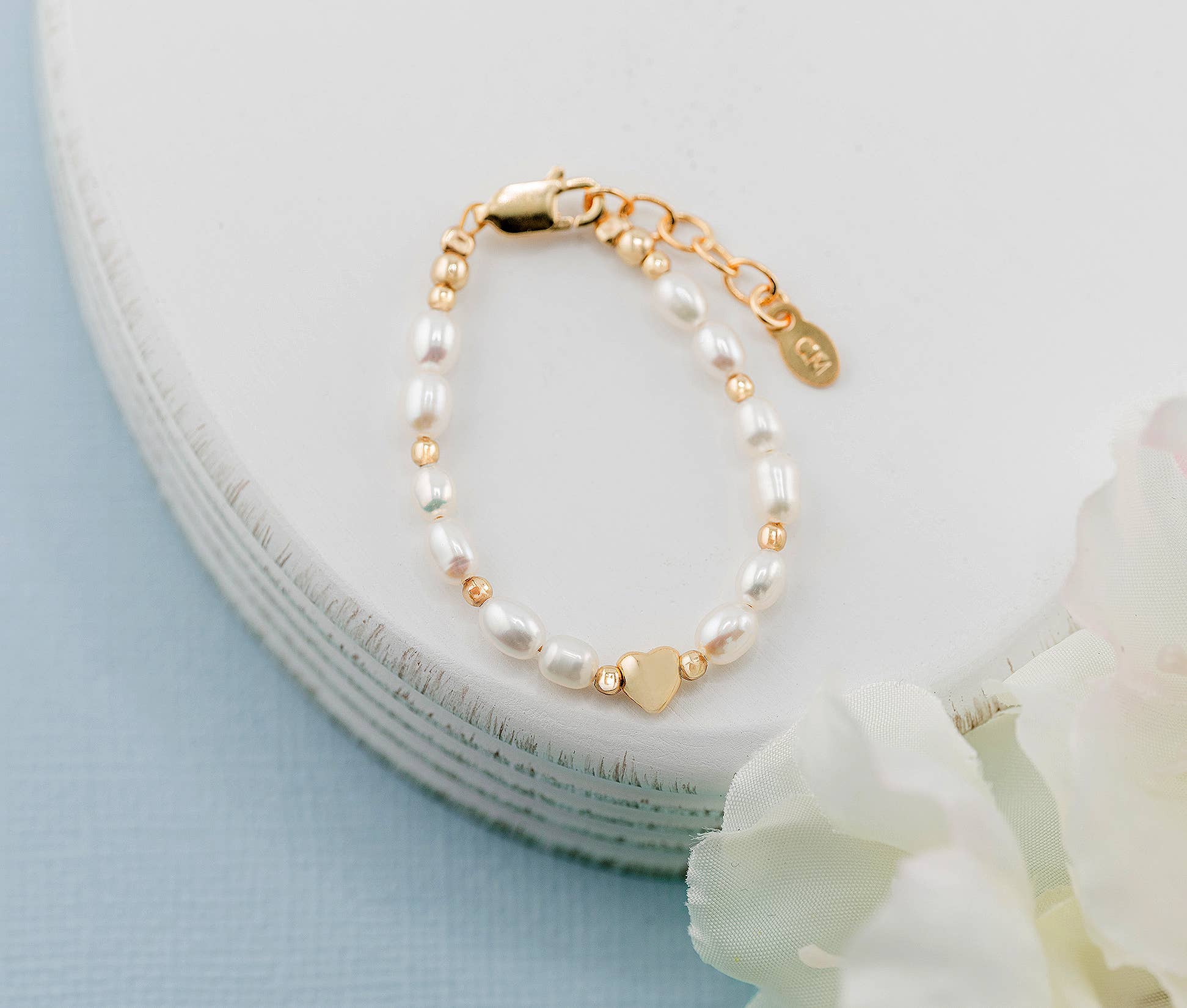 This keepsake bracelet is made with soft white freshwater pearls and 14K gold-plated beads accented with a beautiful drop heart in the center! This is a high quality bracelet in sterling silver with 14K gold plating. Each bracelet has an extension chain, so as the child grows you just move to the next link for a perfect fit. This bracelet is available in three sizes and is great for infants, babies, toddlers, and kids. This jewelry comes in a beautiful gift box. Hand made in the USA!