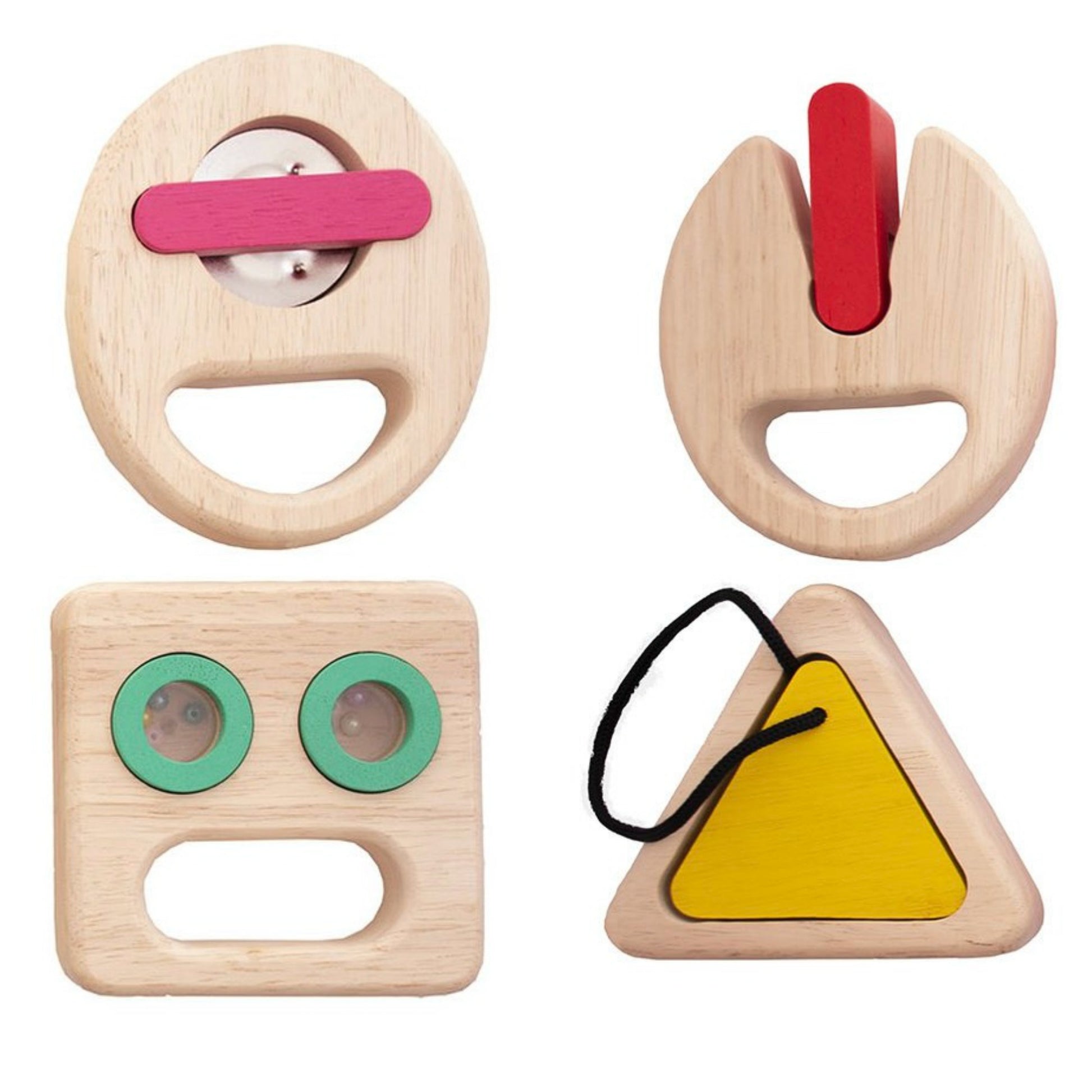 The Musical Shapes Maraca shakes for a subtle rattle sound. Features a mix of natural and painted wood. Includes a square design with smooth carved handle.