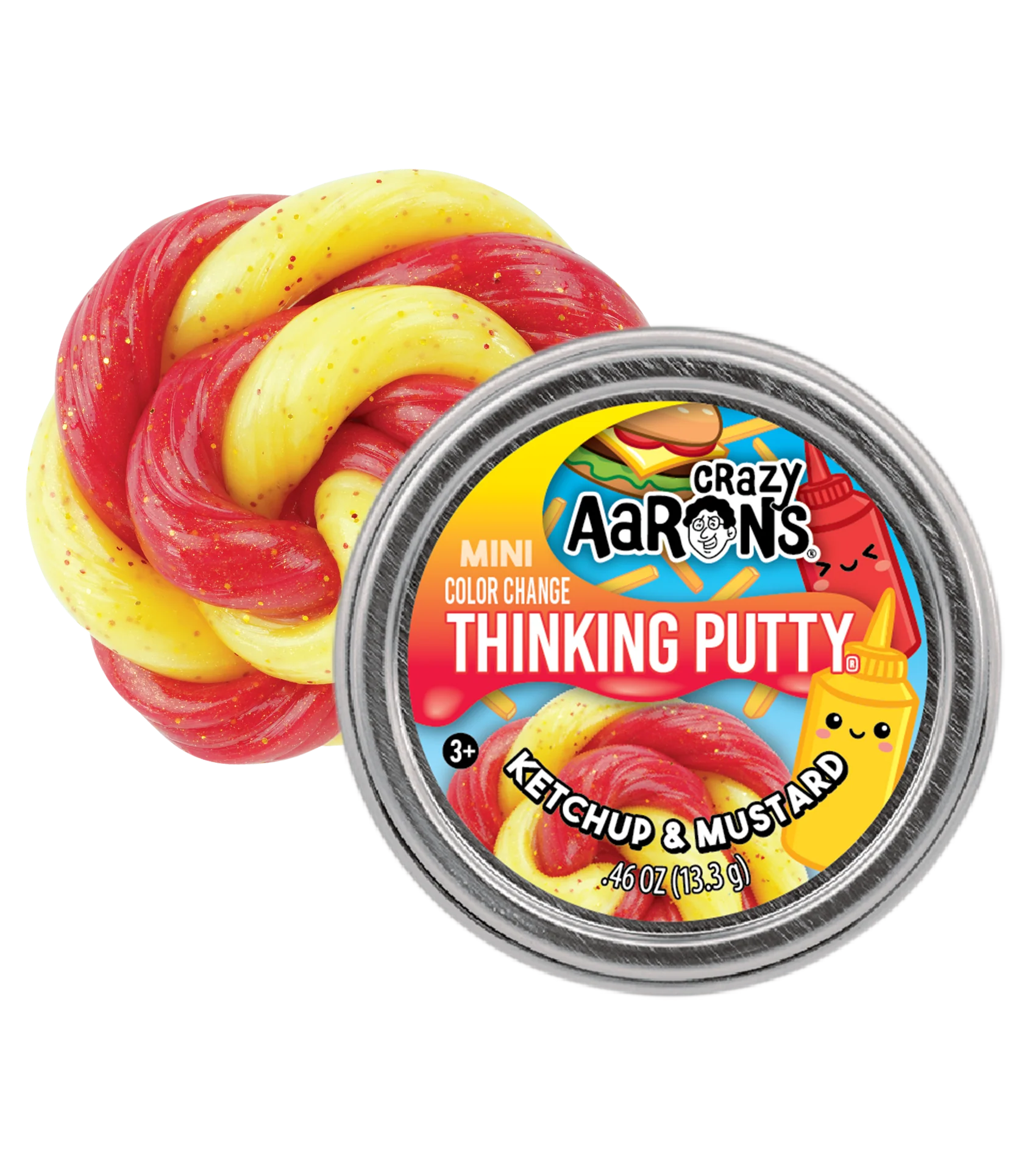 Time to play with your food with a mini tin of Ketchup & Mustard Thinking Putty™. Our color change technology brings this condiment themed putty to life!