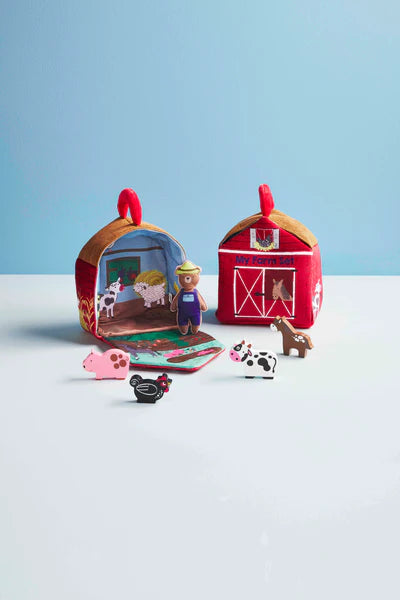 Get ready to tote around this plush farm play set. The 6-piece set comes with a plush barn. The barn set includes a dimensional bear farmer. The set also comes with a wooden pig, cow, horse and chicken. The set is included for ages 12 months and up. This set has a handle, making it easy to tote.