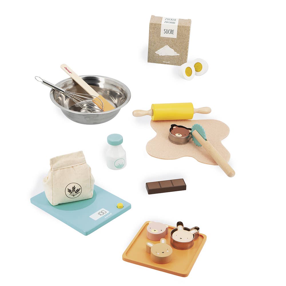 It’s time to make a snack! This baking set will enable your child to become a real little chef! To make great cakes, you need: an egg, some chocolate, some sugar, some milk and some flour, as well as 2 cutters shaped like a rabbit and a bear. Enjoy superb pastries served on a tray. 19 accessories that are perfect for cooking like grown-ups. This set is ideal for developing children’s imagination. Toy made from wood and cardboard for children ages 3 and up.
