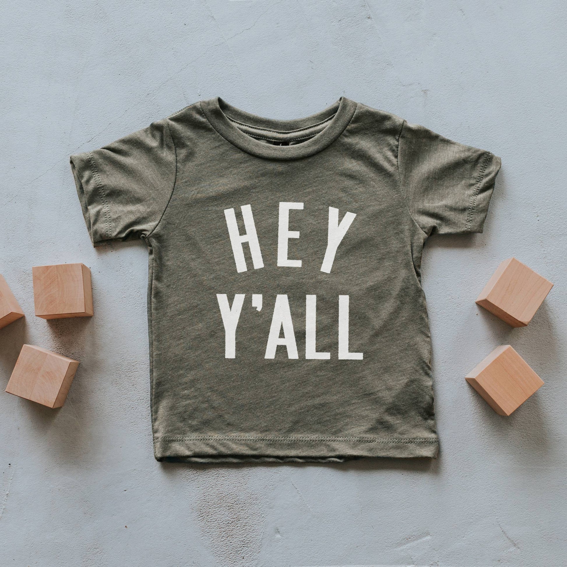"Hey Y'All". Well hey there, little one! This fun kids shirt features modern, distressed typography in white ink on super soft tri-blend olive green fabric. Designed with love and printed by hand in Ohio.