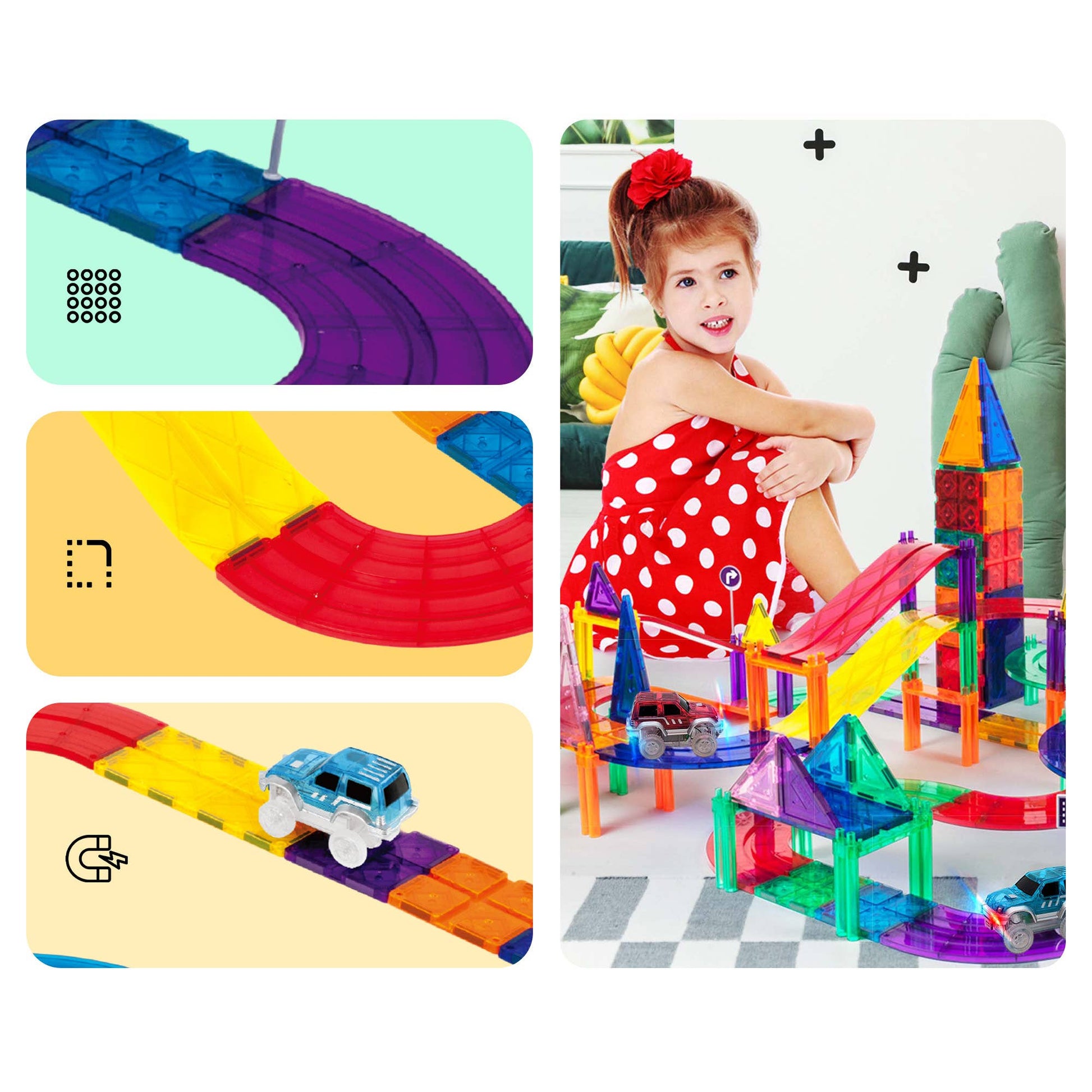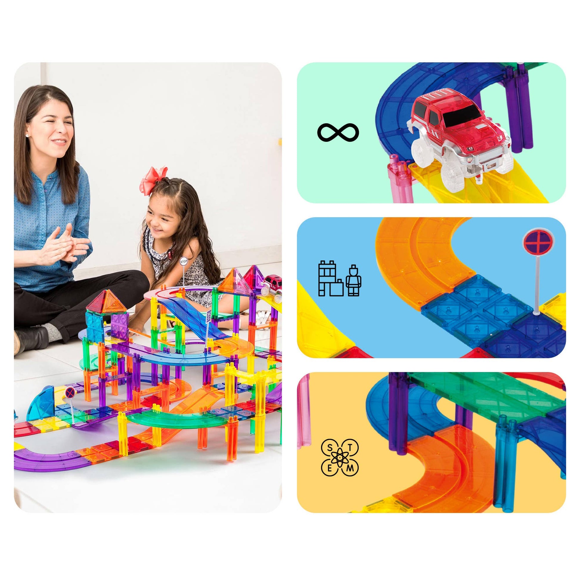 CHILD BRAIN DEVELOPMENT - The 50 Piece Racetrack trains problem-solving skills, hand-eye coordination, and motor skills. Engineer and design a colossal architectural structure through the laws of physics and the power of magnets.