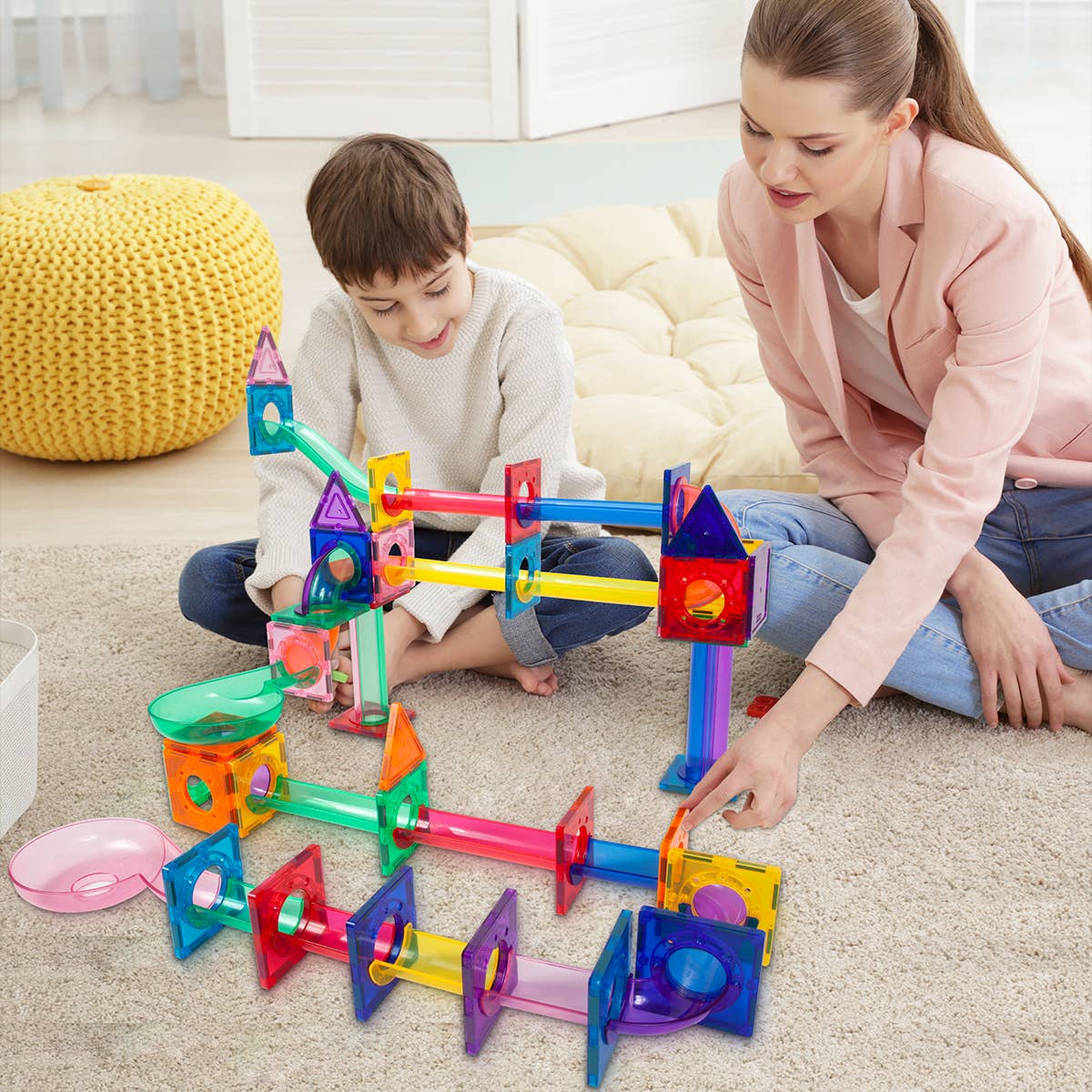 The construction marble run race track toy stacking building block kit features quick connect magnetized translucent color tiles to allow children to easily put the pieces together to create the designs of their own master piece simply via using the laws of physics, gravity, brain power, imagination and power of magnets