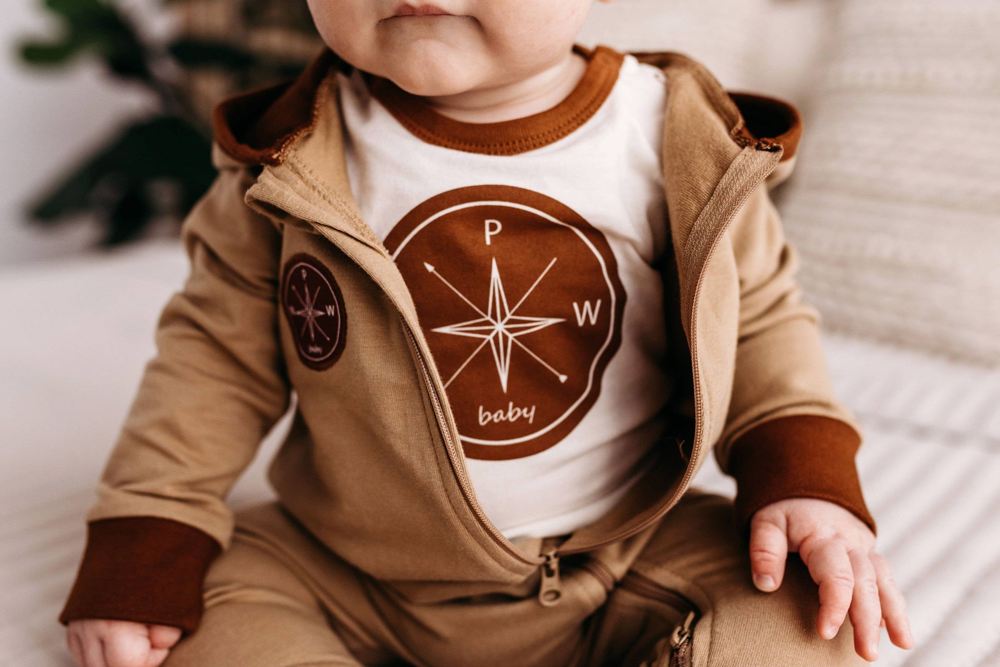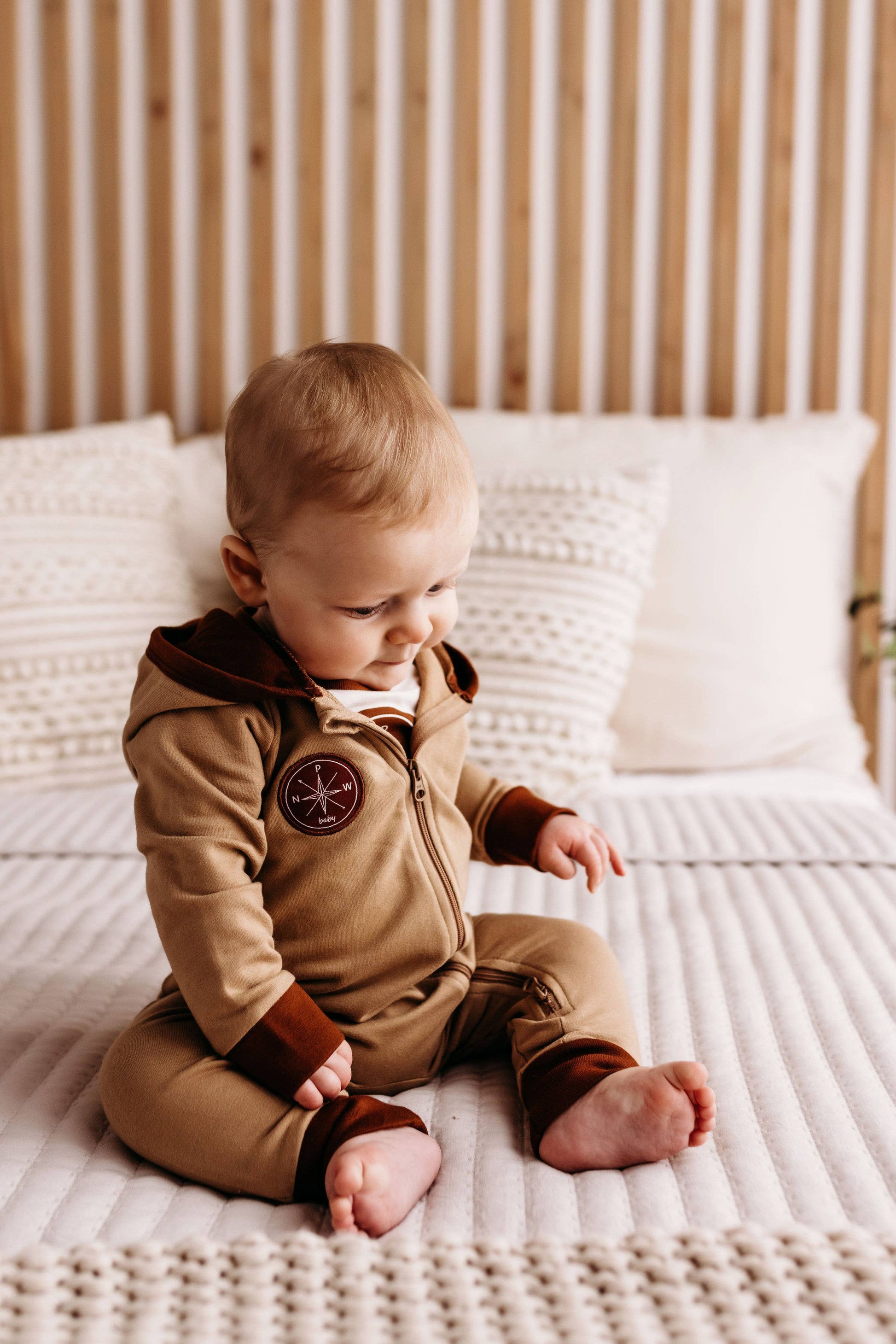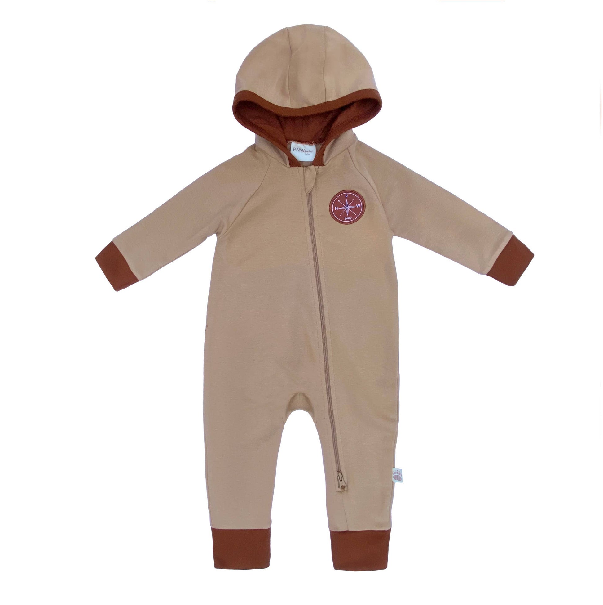 Light fleece hooded zip romper with PNW Baby patch on chest. Perfect for lounging or adventuring around the Pacific Northwest!
