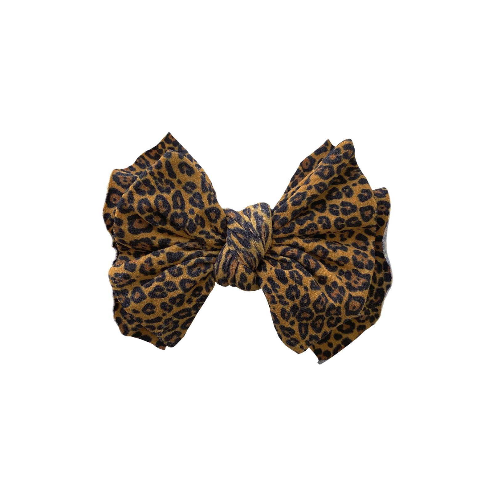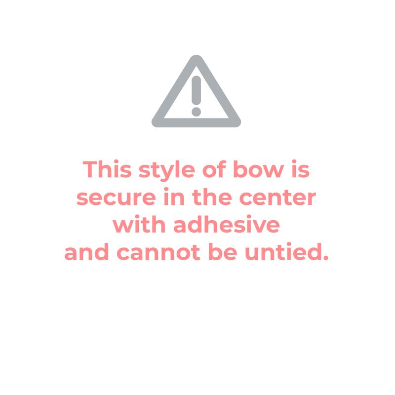 The bow measures approximately 5" across. This style is sewn in multiple pieces and is not meant to be untied. The soft printed nylon material is produced to our specifications in China . Each headband is hand sewn and tied by women in our local community. Due to the nature of small-batch production color and sizing can vary slightly.