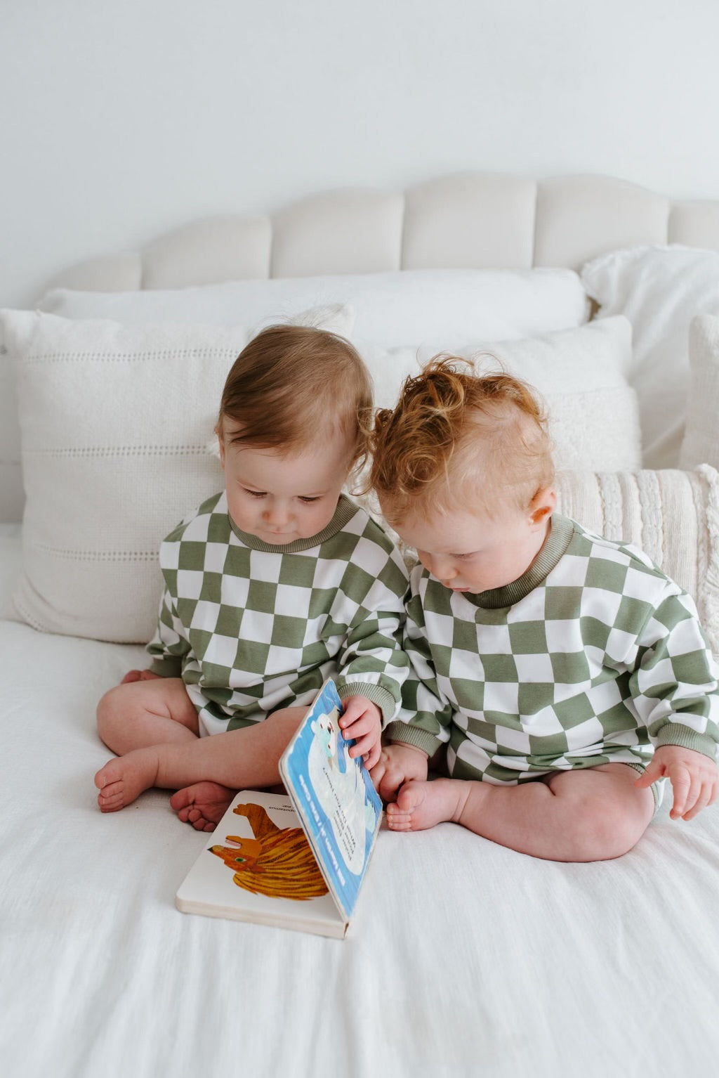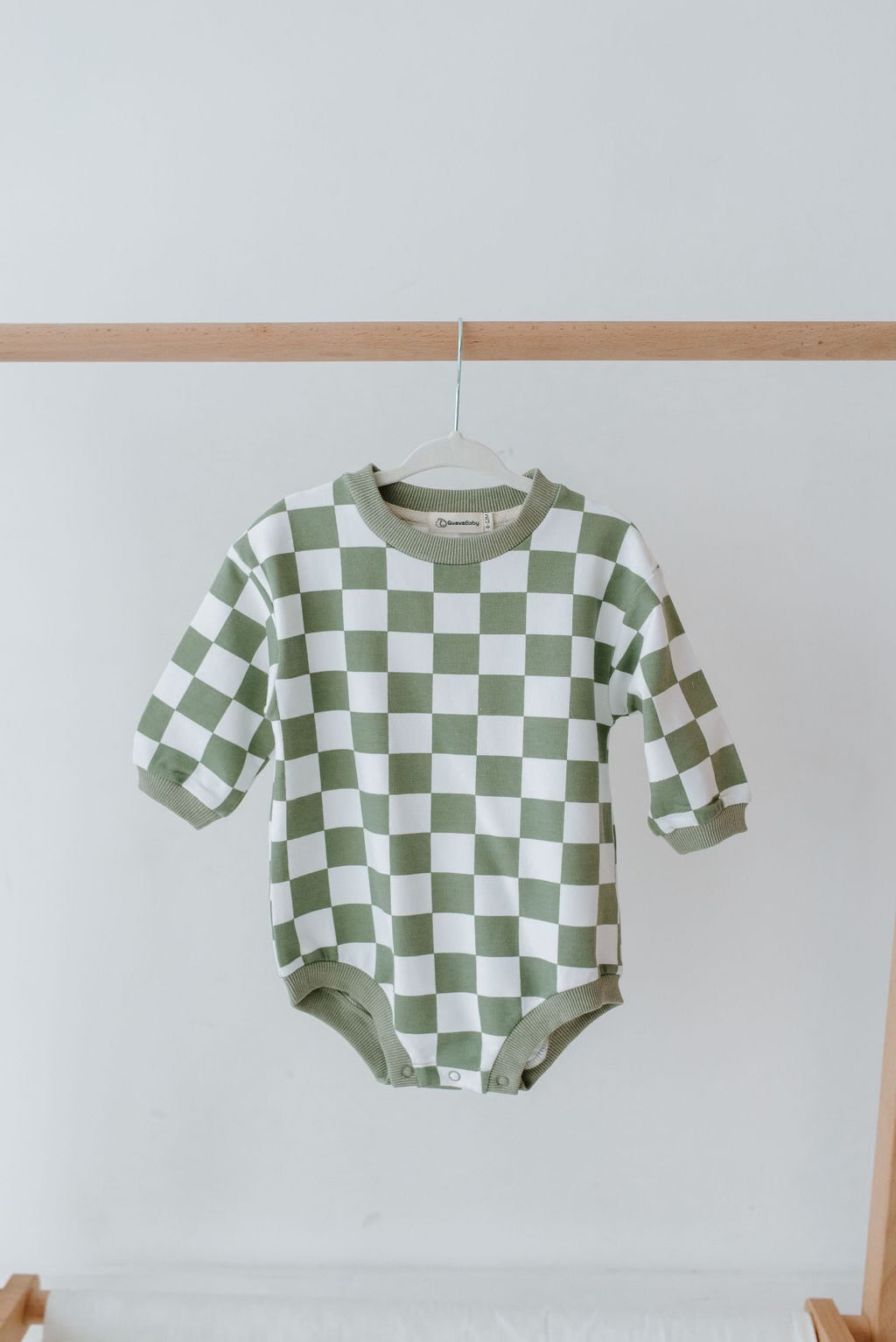 Get cozy and stylish with our new Green Checker Print Sweatshirt Romper from Guava Baby! Made with soft fabric, this romper features a playful checkered print in a bold green color. Perfect for lounging or a day out, this romper is sure to be your new go-to outfit.